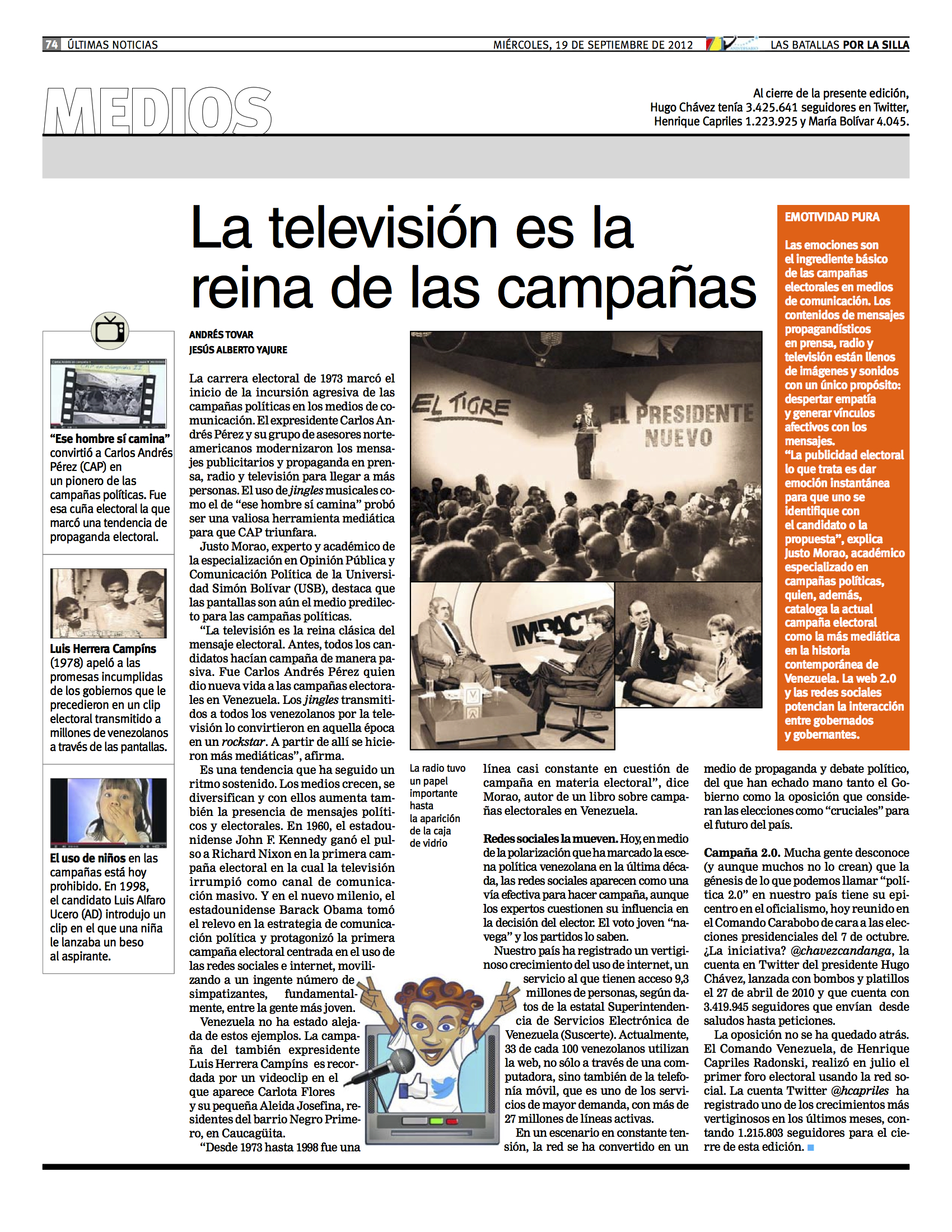 septiembre 24, 2012 La televisión es la reina de las campañas 1700 × 2200 in La televisión es la reina de las campañas – Justo Morao en la Edición Aniversaria No. 71 de Últimas Noticias «La televisión es la reina de las campañas» / Entrevista de Andrés Tovar y Jesús Alberto Yajure a Justo Morao / Edición Aniversaria No. 71 del diario Últimas Noticias / 19 de septiembre de 2012.
