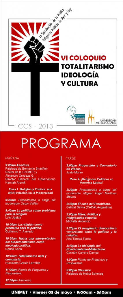 Quiero agradecer enormemente al Dr. Alejandro Oropeza, al Dr. Oscar Vallés y al Dr. Miguel Ángel Martínez Meucci por la invitación que me hicieran a participar como ponente en el VI Coloquio – Totalitarismo, Ideología y Cultura realizado el 3 de mayo en los espacios de la Universidad Metropolitana en Caracas, Venezuela, bajo el auspicio del Observatorio Hannah Arendt.