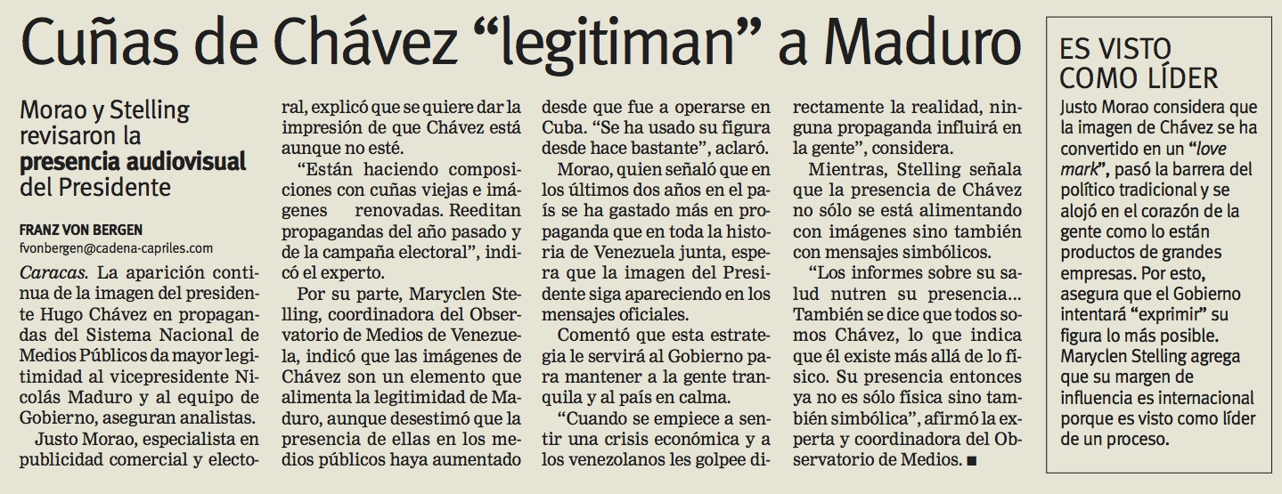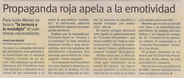 “Empezamos a ver una guerra de cuñas en la que destacan especialmente los mensajes mal intencionados que colocó al aire el Gobierno para meterle miedo a la gente. Son propagandas en las que se amenaza con que un triunfo opositor acabará con los beneficios de las misiones y los distintos programas sociales”, advierte Justo Morao, especialista en comunicación política.
